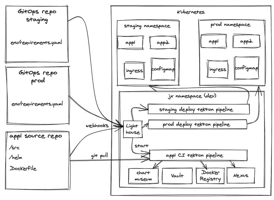 遵循GitOps原则,环境仓库中的这种变化会触发Tekton的部署流水线,使用Tekton将仓库中描述的内容与集群中正在运行的内容同步。部署过程也可以通过jx promote命令启动,该命令将更新环境仓库,从而触发同步。