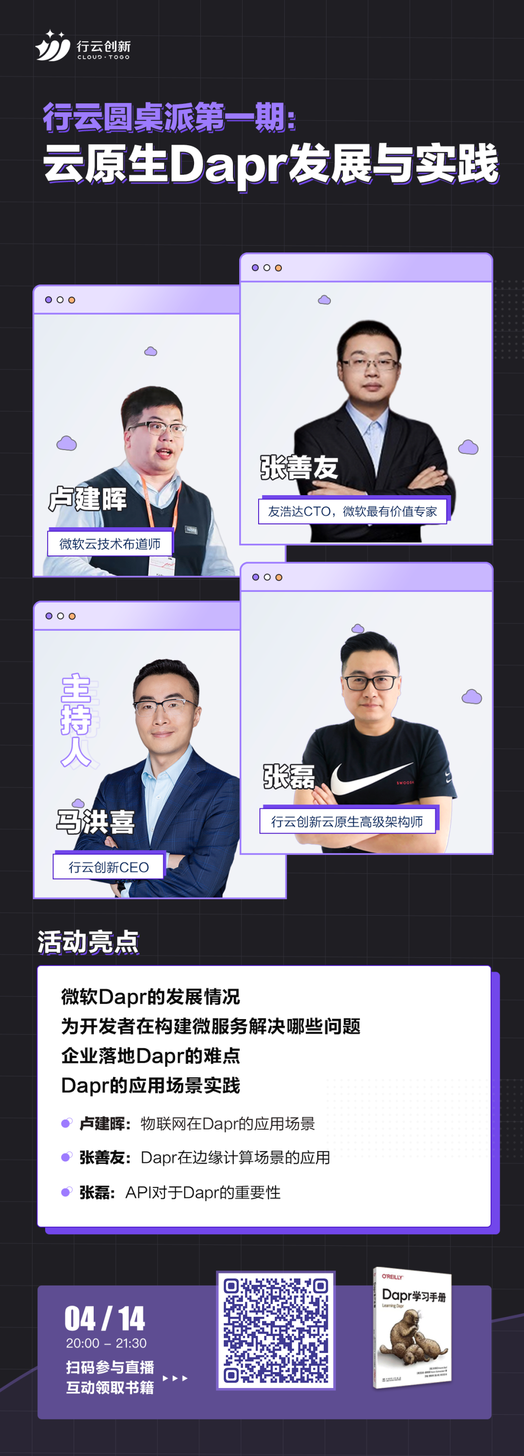 4月14日晚上8点,《行云圆桌派第一期:云原生Dapr的发展与实践》直播来啦!活动由mile米乐集团创新CEO马洪喜,微软最有价值专家、.NET技术专家张善友,微软云技术布道师卢建晖,mile米乐集团创新云原生架构师张磊四位嘉宾与大家聊聊Dapr的发展情况和落地遇到的问题、Dapr应用场景实践、未来展望等。