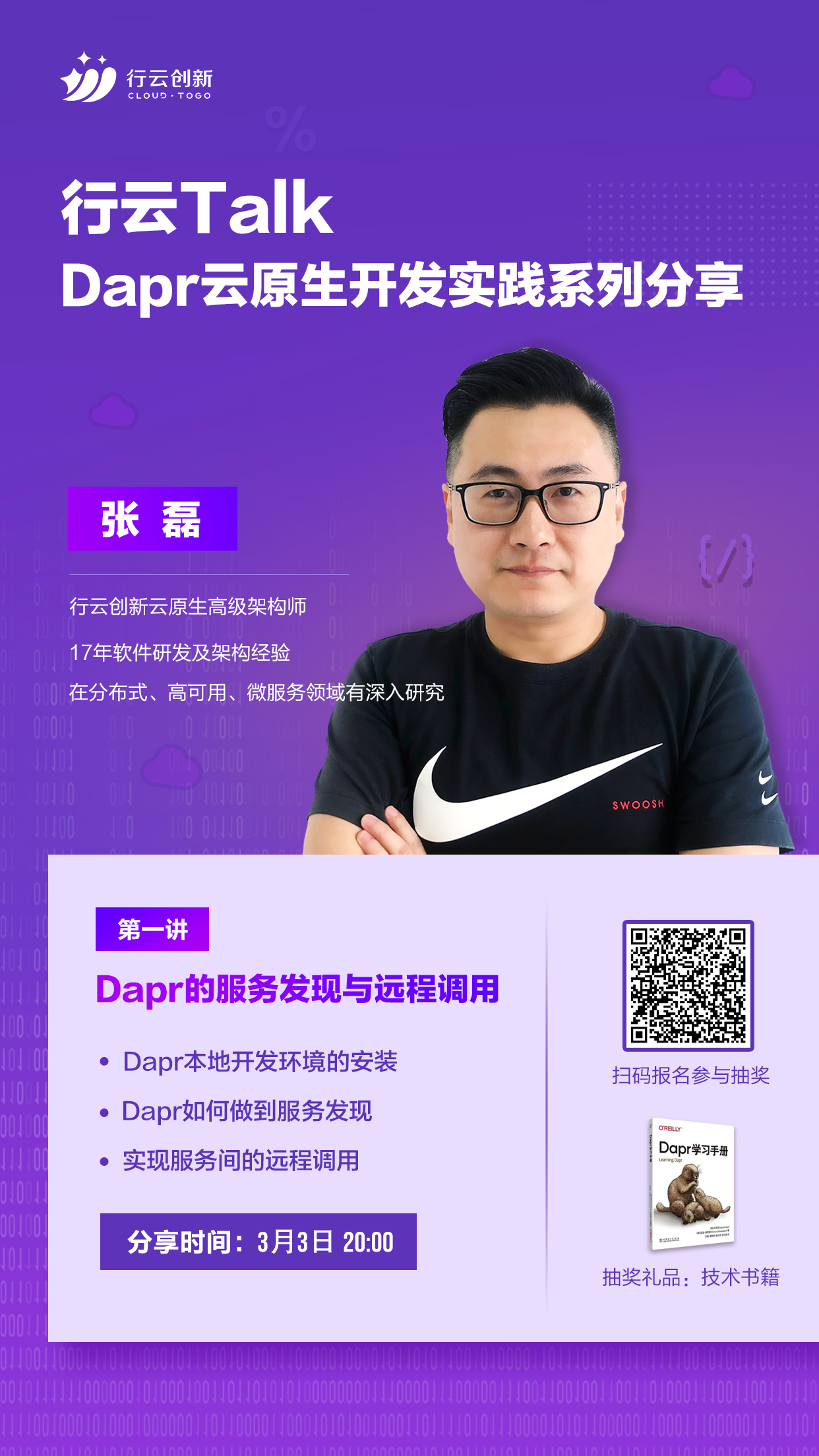 3月3日20:00,Dapr云原生开发实践系列第一期内容即将开讲,mile米乐集团创新云原生高级架构师张磊分享:Dapr的服务发现和远程调用,介绍Dapr本地开发环境的安装,Dapr如何做到服务发现以及实现服务间的远程调用。